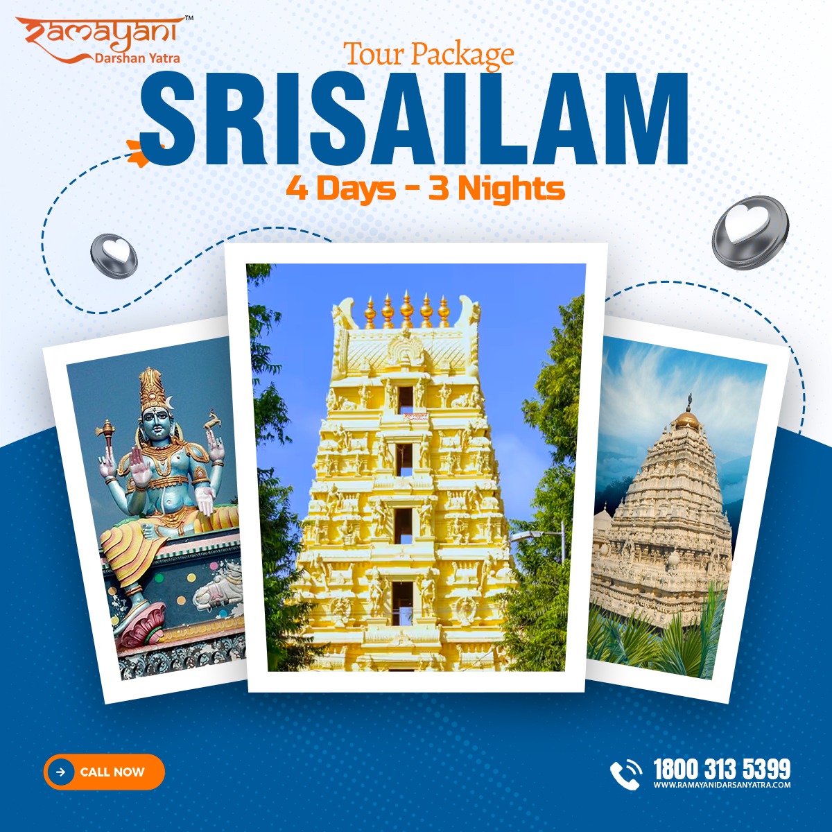 Embark on a 4-day Srisailam tour with Ramayani Darshan Yatra and immerse yourself in the spiritual and natural beauty of this sacred destination. Renowned for its divine temples and scenic surroundings, Srisailam attracts devotees and travelers from across the country. Marvel at the magnificent architecture of the Srisailam Temple, seek blessings, and experience deep spiritual peace. Along with religious exploration, enjoy the serene landscapes and tranquil atmosphere that offer complete relaxation. Join us for a memorable journey blending spirituality, devotion, and nature’s splendor.